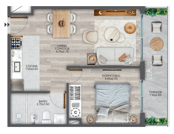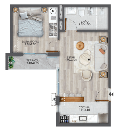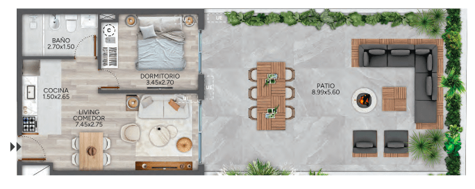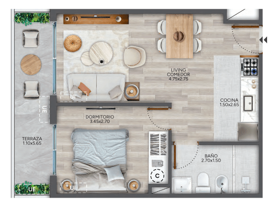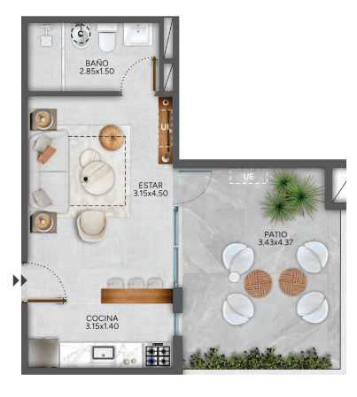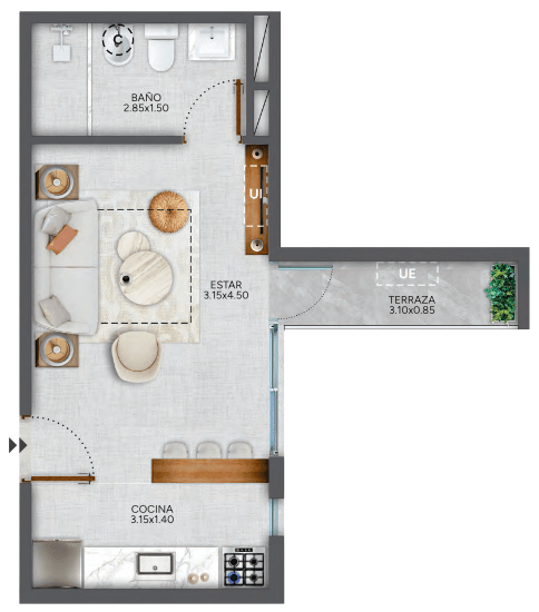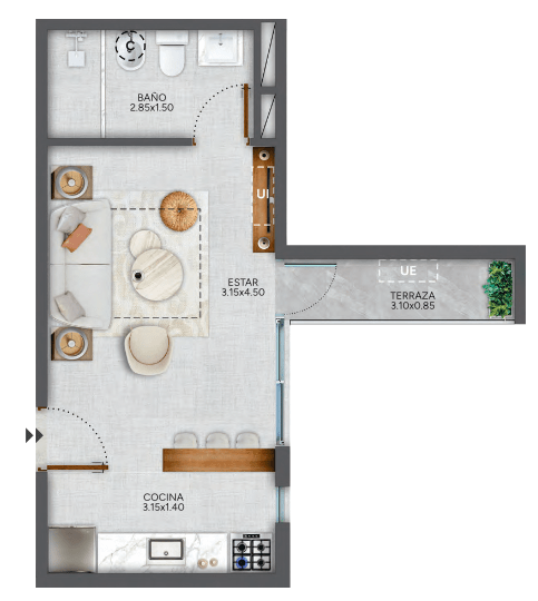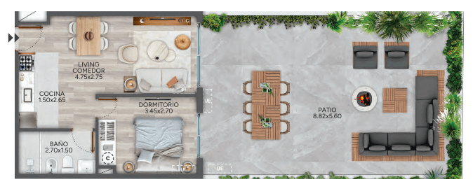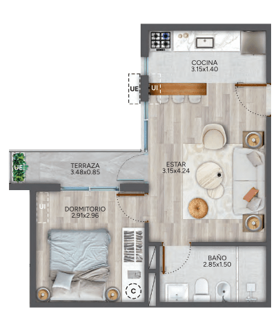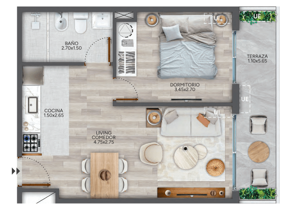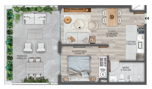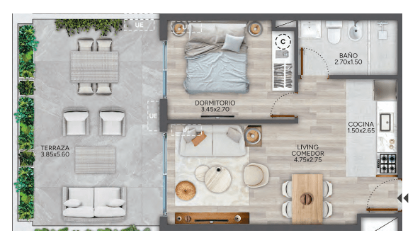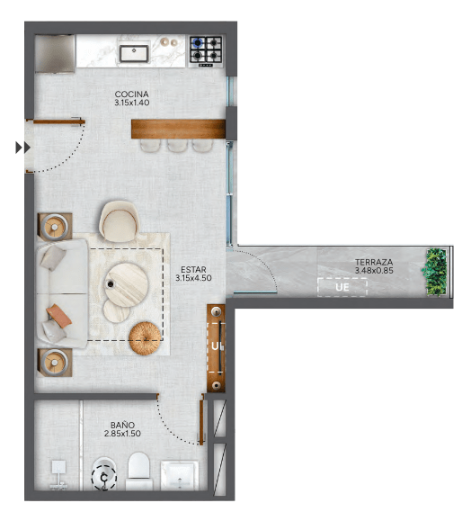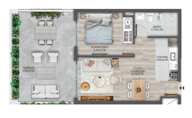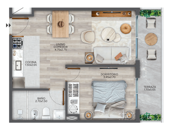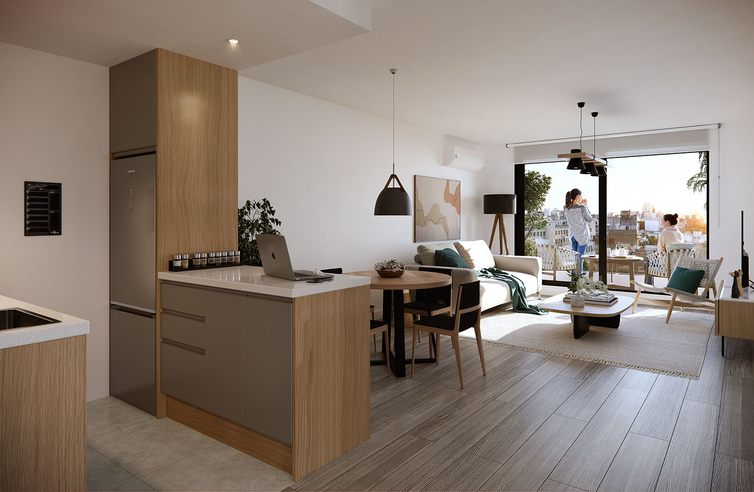 La presente información es preliminar, orientativa y no vinculante, quedando sujeta a las modificaciones que por causas técnicas, naturales o impuestas por autoridades competentes pudieran ocurrir al ajustar el proyecto definitivo. Las imágenes pueden presentar diferencias con la versión final y las medidas definitivas surgirán del plano aprobado y/o de la mensura del agrimensor. La Dirección de Obra se reserva el derecho, en forma unilateral y en cualquier momento, a modificar terminaciones que figuran en las ilustraciones, sin perjuicio del diseño ni de la calidad. El mobiliario y equipamiento son de carácter ilustrativo y no forman parte de las unidades. Antes de adquirir unidades, solicite al vendedor/promotor la información técnica necesaria a efectos de confirmar los datos y poder tomar una decisión informada. Las áreas están consideradas según los criterios de APPCU.