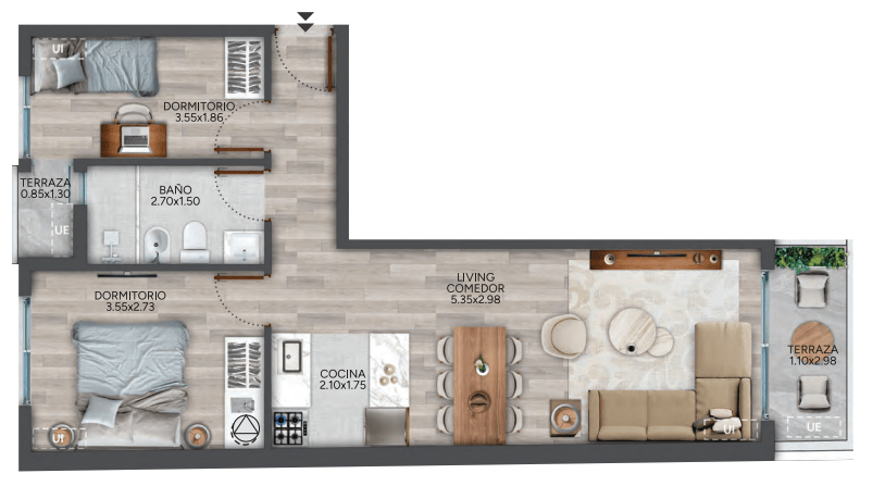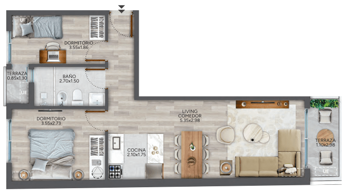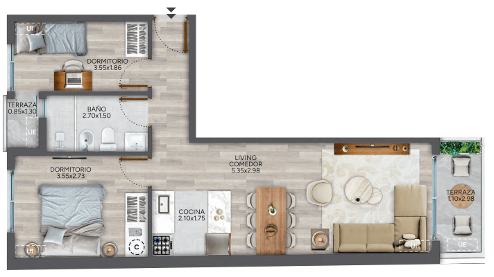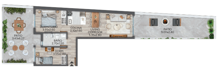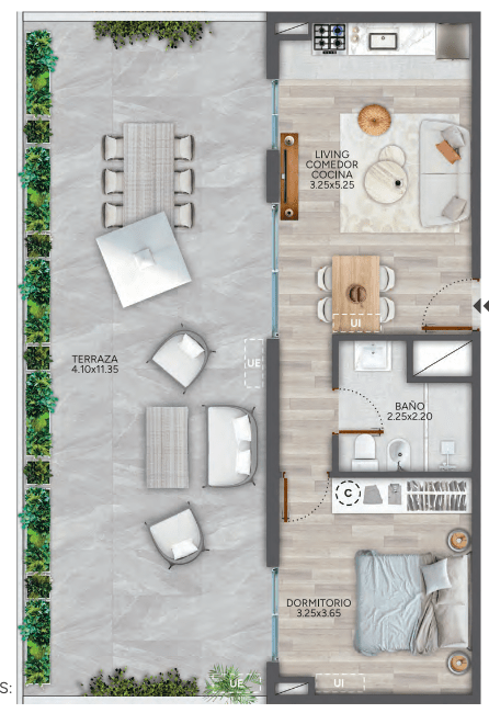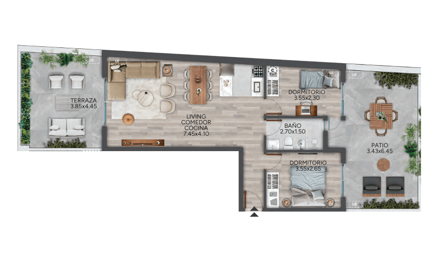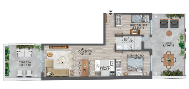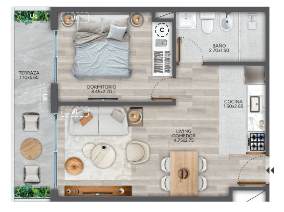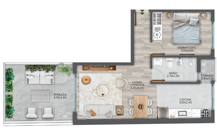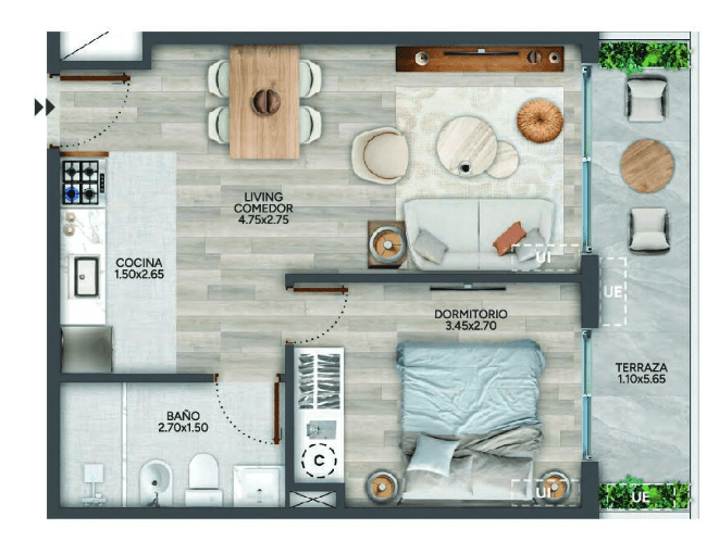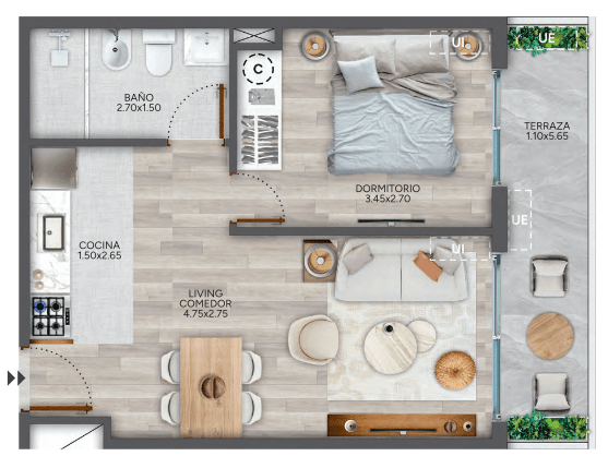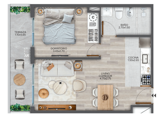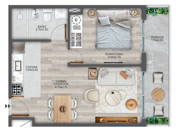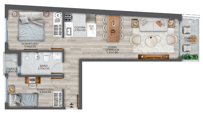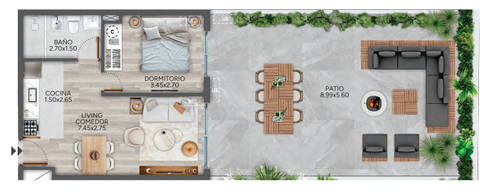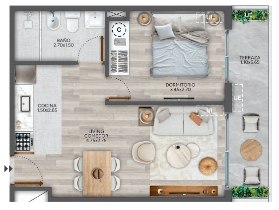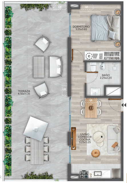 La presente información es preliminar, orientativa y no vinculante, quedando sujeta a las modificaciones que por causas técnicas, naturales o impuestas por autoridades competentes pudieran ocurrir al ajustar el proyecto definitivo. Las imágenes pueden presentar diferencias con la versión final y las medidas definitivas surgirán del plano aprobado y/o de la mensura del agrimensor. La Dirección de Obra se reserva el derecho, en forma unilateral y en cualquier momento, a modificar terminaciones que figuran en las ilustraciones, sin perjuicio del diseño ni de la calidad. El mobiliario y equipamiento son de carácter ilustrativo y no forman parte de las unidades. Antes de adquirir unidades, solicite al vendedor/promotor la información técnica necesaria a efectos de confirmar los datos y poder tomar una decisión informada. Las áreas están consideradas según los criterios de APPCU.
